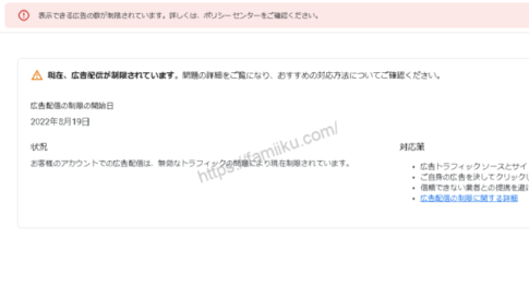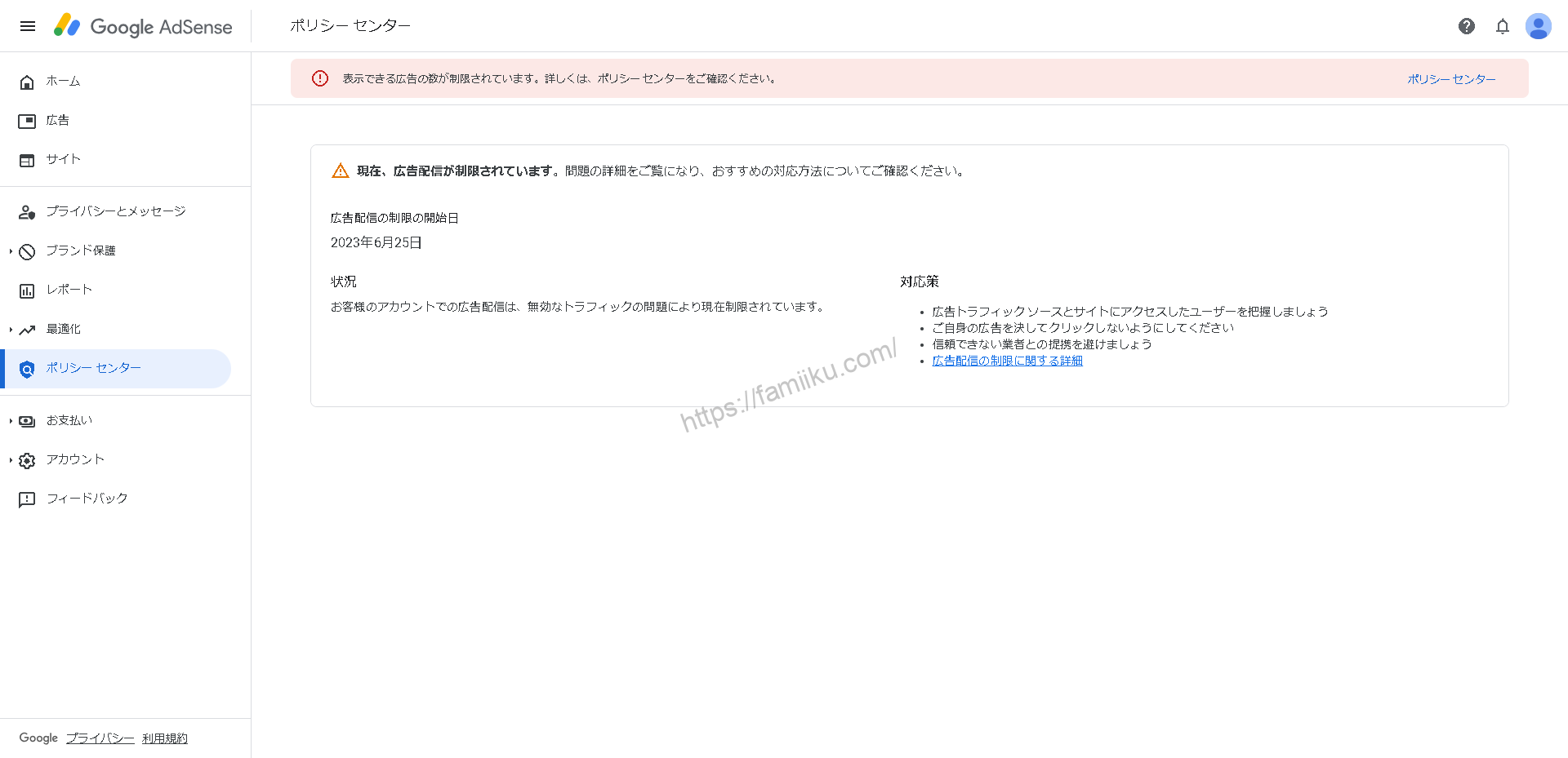 下記の通り、2023/6/25(日)から広告配信が制限されてしまいました(2回目)ので、備忘録として残します。